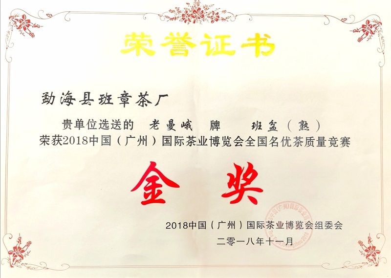 班盆(熟)荣获2018中国(广州)国际茶业博览会全国名优茶质量竞赛金奖