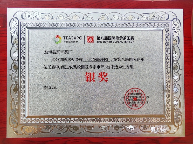 老曼峨庄园在第八届国际鼎承茶王赛中,经过农残检测及专家评审,被评选为生普组银奖