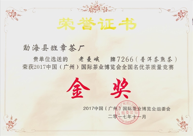 7266(普洱熟茶)荣获2017中国(广州)国际茶业博览会全国名优茶质量竞赛金奖